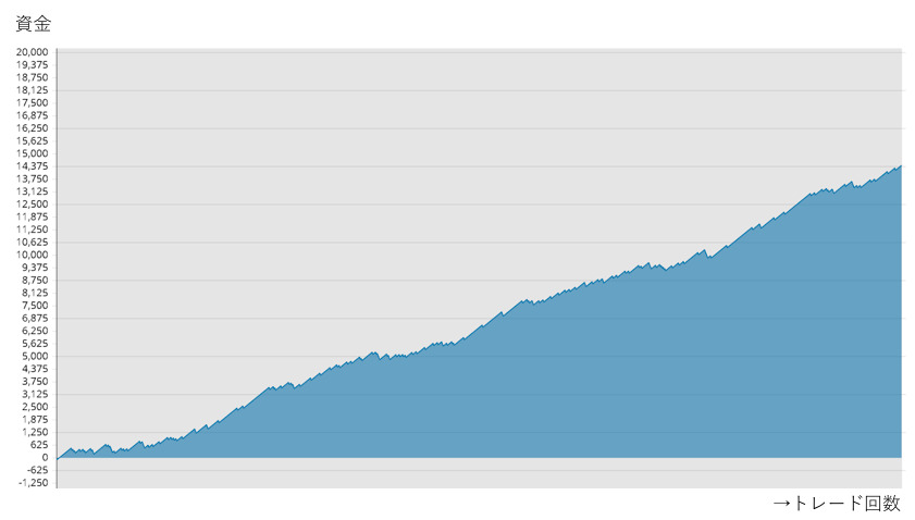 また、この勝率84%の手法を用いて、期待値(勝率×リスクリワード)で計算した結果100回トレードするごとに資産増加数値になることから、何千回、何万回トレードしたとしても必ず右肩上がりの結果になるのです。