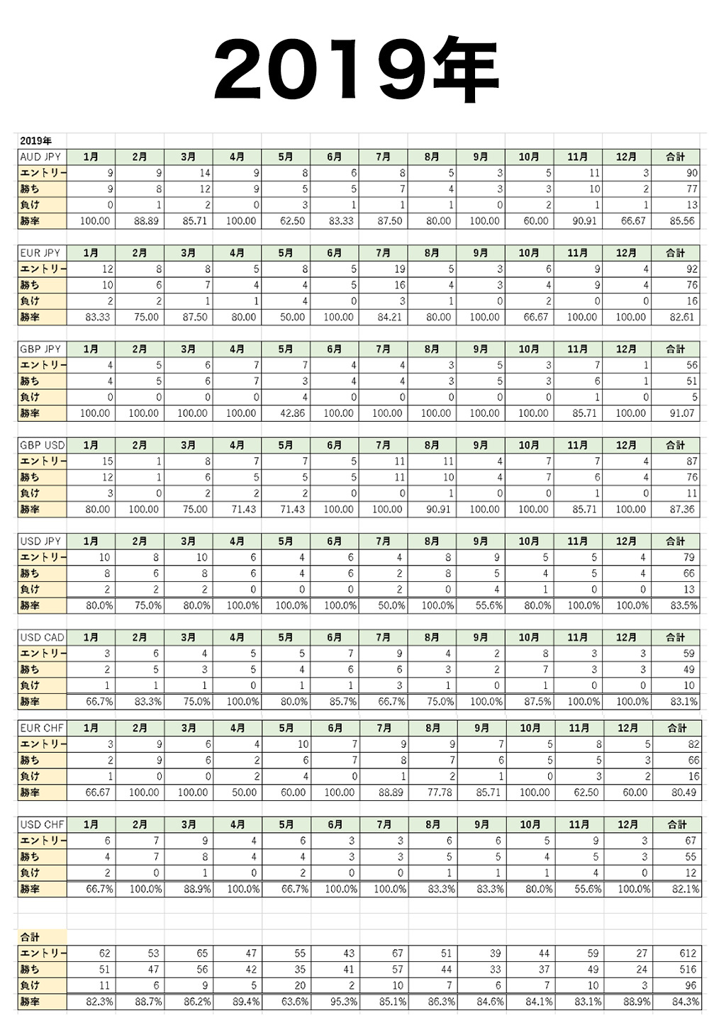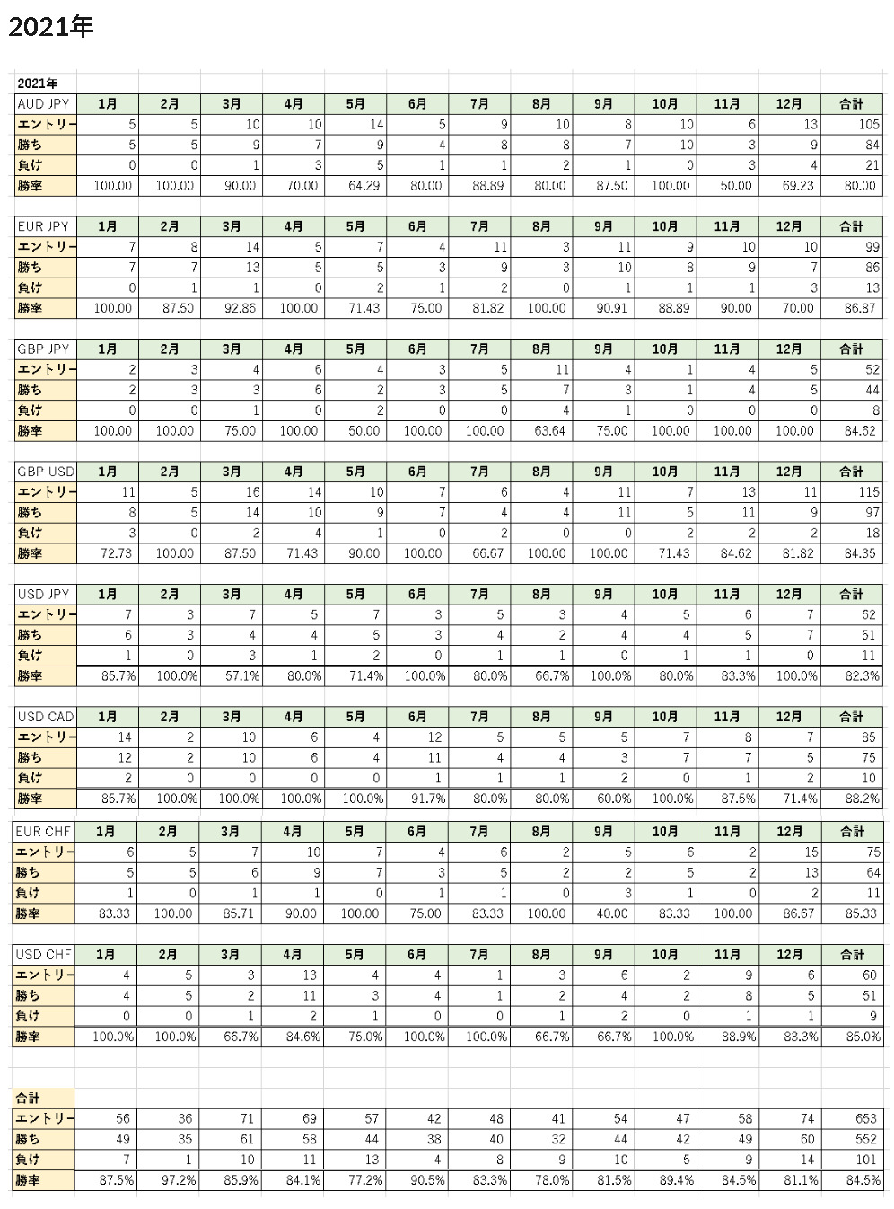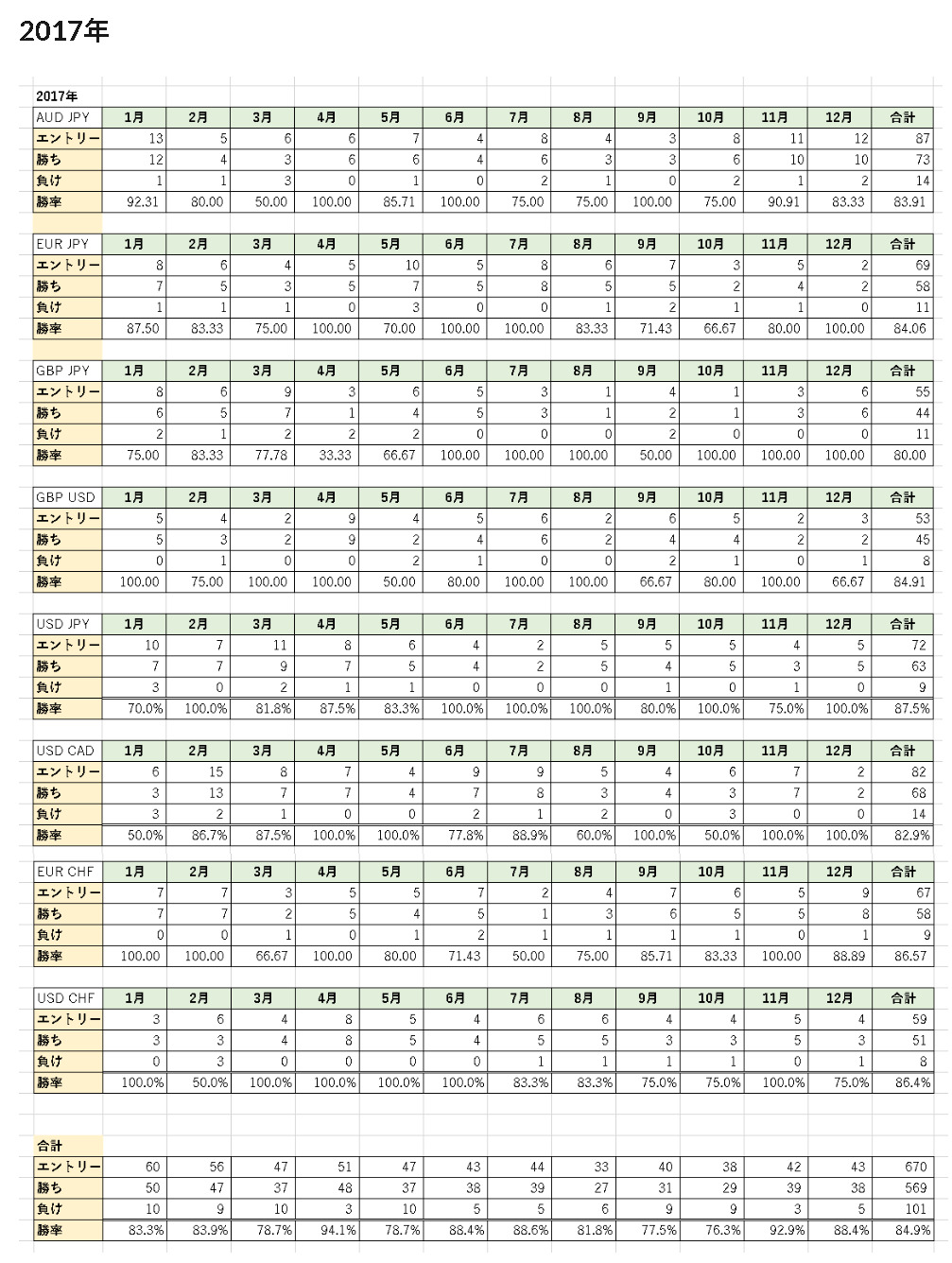 1つの通貨ペアだけではなく、複数の通貨ペアで勝率が安定していなければ「勝ち続けられる手法」とは考えることができないので、主要8通貨で同じ手法を使って過去5年分の勝率を徹底的に検証しました。