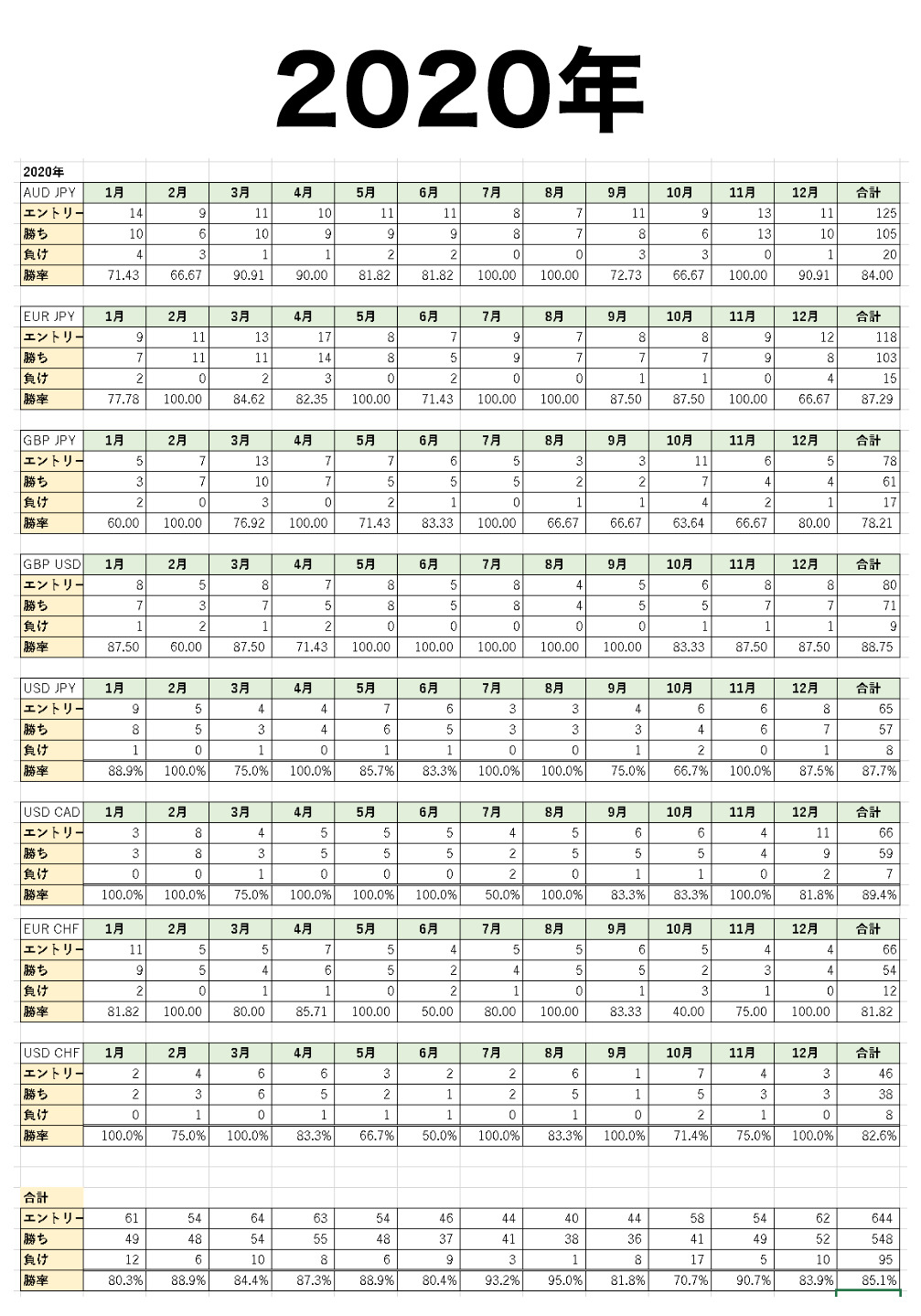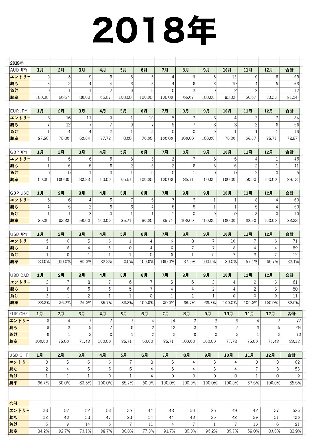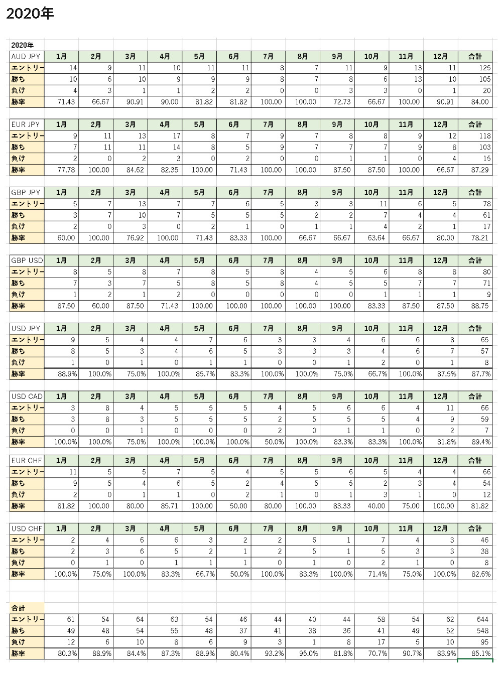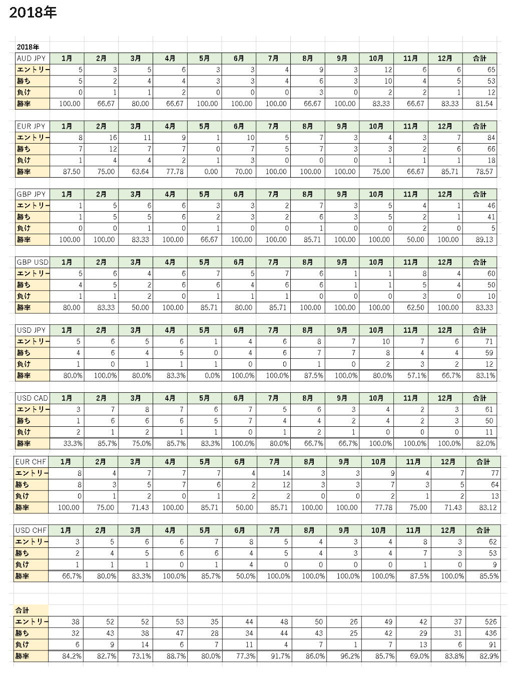 1つの通貨ペアだけではなく、複数の通貨ペアで勝率が安定していなければ「勝ち続けられる手法」とは考えることができないので、主要8通貨で同じ手法を使って過去5年分の勝率を徹底的に検証しました。